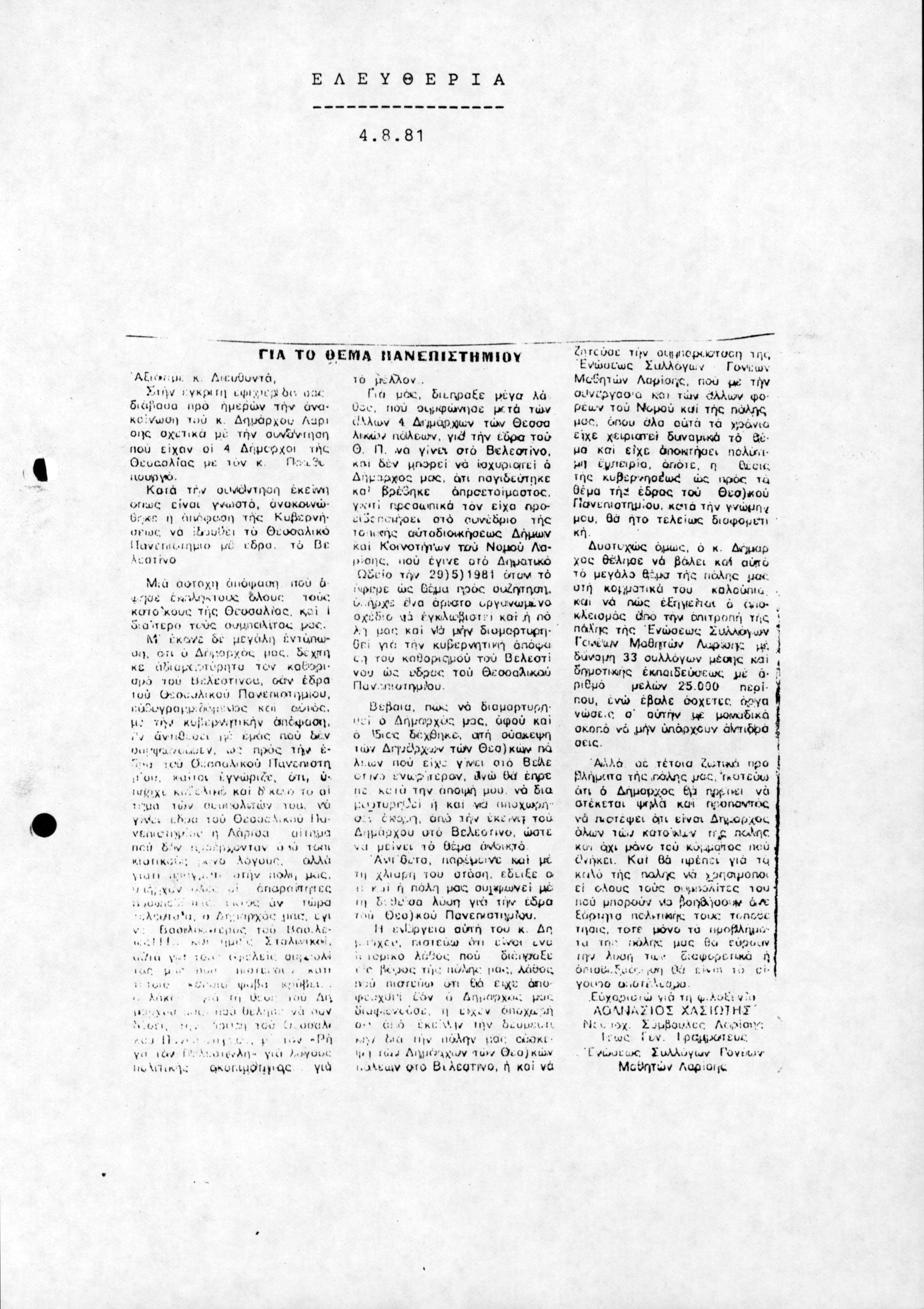 ΕΛΕΥΘΕΡΙΑ 4.8.81 ΄ΑΣιι'ι;.μι. κ. Λιι:υ3υν…τό. Στην ι'γκριιη ι.ι|ιι;.ςιι.';! Οι". τι…: διάβα… προ ηµερών την άνω… κι=Ξνωυη ι…) κ. Δηµάρχου Λυρι σης σχετικα με την συνάντηση [του ειχαν oi 4 Δήμαρχοι τής Οευαολι'ιις …. τζιν κ. |-|«."."ι.΄ΐι ιιυυ»ηώ. Κατά τα οιιΜντη.υη έχει… (πως είναι γνωστό. (ινα-κοινώ- αν…" η ι.΄ιιώιρ(ε.ση "τής Κυβερνή- ιιι'…ι:… να τ…"… τό Θεώ-ολικό Πιινι'ι.ιι,-ιηµ… μι; ι'δρυ. τό Οι? -…-…;…ινο Μάι αυτο… αυτά…… που Οι της…" τ΄.'γ..".).ιμιυικ Όλους τους κατά…… της Θεσσαλίας. και ι δ:α'ιτερι'ι τιμά; οι.|μ,ι'ιςιΜτος µας. Μ΄ εκανε δι' µεγάλη εντυπω- ιιη… (…. ι΄ι Διι,ν.η….χιτι… μας. δεκτη κι; ι΄ι7.1ιυµ.τιτι΄-,'>ητυ τω κοί;ι'.ι…;)ι… τιµ.) …… ιι::λι'υτι…υ. οι"… εδρα |…] (.)….;ι>ι;.ιλ…υι΄ι Ποωι'τιι…ημιου, ι'.ι΄;.΄ΐ-υγρ(ιμμ.ι΄'ιιη:να"… και ("υιός μ: τη: κυί'.ι"|>'-,'.-μικήν άιτ(΄ψυατ. ."; άν-ιιΟ..ι;…'.ι …'… "µία"… που δεν ')ιιξ'ι|'υ.|ι.ι.ι..'ζν. …: τιµάς τήν τ':- ΄ζ'ιι :… ().;('.Πιιλ|ΚΟύ ΙΤανε-|τι01η …'… µια… ι'.γνυιριξτ… ότι, Ο…… |ι!ξ.ζι…χι, κι...'….Κινι…'΄, xoi HAUL: Η.) ul aqua .… ιιι.ιιι.'ι.>λι';'ι΄ιω του. Κι "γ.-ν'… "ως: του Οευζ)ι';Χ.κ.ιυ Hu- \'!.nt.“u‘l'_\',".-\' η Λάρισα (ΜΠΕ!) um" δ'-ν '. :.?;'.-,,υ…ντιι» η… το… "Λουκά.; …… λι')γυιιΡ… αλλά χι».ιιι .ιςι-'γ…..'ι- ιιιι΄|ν πολη. μια. (Σπαρτιάτη-ικα ;.,ι;.,,.'…. τι ι :…ι'…µ.'… (xv Ντη… ':.λ",ι!ι.…ι'ιι… η |'.…ι-…ι'ηνχιζ>ιτ …μιιι?. Lyn. v. f3<10rla~.-a.:,un‘, Τα) Μπαλί.- .Σ |τιλι.-.:ικοΐ. …ιι-'ι.;τι.ν' τι…-ζ? !! . γ…." "Η," |.ΐ ι..΄ι'ιιι γ…! τι.… ι-.ι-:'λιιι. mum»; MM: µ ιτ-,ι' |ι.ι)Ιι.ιι΄ι| . null ; '.ι-..ι.- -:;.κ … ιι…|Μ ι-ς-ι΄ιβι.ι. . : Μι… .- -ι … αν: mu |"; µ……)…ι ...'ι, ως… ("Άντεν ντ΄! των 3.……ι… .… των… …,… ζ.: οι…… .…ι…'ι Η..…. …η «. ,ι µια -|"ή γω ια; ι'. .!,ιτις-.ιλη… για )..…ιιγυι;ι.' ….κιτ…τ…; ρκυι.ιιι…σιι|ιαε για … το ρ…ελΜΑ ΄ίι΄λΝεπιΣτιιΜιοι το μελλον. Για µας. διι.ηροΕε µεγα Μι …. που οι,ι,ιφώνηοε µετά των ι.".λων ‘l Διι'ιµφ……ν των ΘΕΟ… Μ…" ι'ιάλ8ων. γιό τήν σε»… τού Ο. Π. .… γίνει στό Βελεστίνο. και δεν µπορεί νά "ισχυριατι'ί ό Δν,µ:ι.;…ο: µας. ότι πονάει)…" no? βρέι3ηκε όπρσετο'ιµοοτος. γι…; τψςοω…κό τον είχα npo- ει΄.3:ιτι:'ιι',οει στό συνεδριο τής wan-m: αύτοδιακήσεως Δήµων και Κοινοτήτων πώ Νομού Λυ- µ΄.-οιι…ς. που έγινε υιό Δι…τ…ό Ωδείο την 29)5)1981 ("αν τό :΄νι)ι.'|)ε ώς Θέµα αρα". συζητηση. ……»- ε'… άριστο υργυ.νωμ΄.ν0 οχι;δ'ο "& τ΄'γκιλωβιοτε'ι και ή 06 ).'| µοι: και για μία διαµαρτυρη- ΄ Ο… γτ(΄: την κυβερνητ…η (πως… ι.] του και]οριε.μου ται": Β…… νου ώ: ώρα". του Θεσσαλικού Γ!υν.τ.ι.ιωημιου. Βεβαια. πως νδ διαµαρτυρη- mi 0 Δηµτιιρχι΄.ι:: µας. όφού και ο ιδιος Βαψιμο. Μή θάψει… .… Διµέρχυ;-ν των Θω)κ… Μ λ:.ων που ε…; γινει στο Βάλε mu.) ενα-;…΄.ιερον. .… … εως …: µε… την αποψή μου. νδ δια ;.:τι…ιτυ,;ιι…ι,'.:ι η και … (|.ιωχω.΄)η" υ…; ι'κ;»,'.ι41. ο…) τήν εκει-νι] του Δ:|μι΄ιµχου …… Βελωτινο, ώστε … μείνει τό Θέµο ("Ότι-πό 'Α….ιι'6υτο. παρέµεινε και με m Α…… του στάση, εδιιΕε ο :: ντι ή πόλη µου: συµµωνεί με … ξ.….:Ιι:υο λα… γιό την εδρα :… Θεσμοί; Πανετνοτι…ωυ. Η ι:»|;ιργι'ιο 00111 του &. Δη ι.:.χτι-. πιστεύω ότι ι:΄-νυι ενα ".; ιι:µ…ο λι΄.'",'…; που διι΄:ι…Εε ι 'ι ν…»… την… πάλη: μας, λάθος; ιν;….΄ι πιστευω οτι €κ΄τ ενώ: &… ψ;..…χ…)ι'ι &… ι΄ι |;η,.(ν,'>χ…1 µπι- ζίι…ιιµι'υιιζσι:… η ε=ιλ…ν ειπαµε... ο…" (::!) των." την Mumzm‘. ι.:…-| ?.ιι΄,ι Η" πόλιν: µας ζώο,". ι… …… Λιτμι3'…ων …, Θεσμών ι.)Νι.υιν ο… Βιλ60Τ|ΝΟ. ή και να (grew: την οι…ι.ομ.υ…οη τιµ, ξν'ώυτ.'ως Συλλόγων Γ ("των Μαθητών Λαρίσης, που µε την συνεργασια και τών άλλων φο- ρε…; του Νοµού και της πάλης µια-α. όπου όλο αυτό τό χρόνια ειχε χειριστεί δυναµικό τό &. µα και είχε αν……» πολυτι- μιτ εµπειρια, όπως. η Οι…… της κυβερνηοΐωξ ώς τιµές το ξενα τη: εδρα: του Θεσμοί: ισνεηιοτη,-µ.