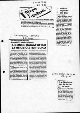 & εΝι…ε€9ΣΗ 95-Ψ8( Η διοικούσα επιτροπή του πανεπιστηµιου θεσσαλ1ας διοργα- νώνει συµπόσια στο Βόλο Θα µου πείτε τώρα ποιό πανεπιστήµιο αυτό που θα ιδρυθεί σε είκοσι χρόνια; ' Ε !ναι αυτό. κα µην κατατρ0χεσθε µε λεπτοµέρειες γω! µπορεί να εξοργισθοόν οι αρµόδιοι και να µην δούν πανεπιστήµιο ούτε τα παιδια ….ψα µας (όπερ κα πιθανότερον) E L V eneYGEPIAI. AWxin; 25 Θα ΓΟΡΓΑΝΏΝΕΤΑΙ ΑΠΟ το ΘΕΣΣΑΛΙΚΟ ΠΑΝΕΠΙΣΤΗΜΙΟ ΔΙΕΘΝΕΣ ΠΑΙΔΑΓΩΓ|ΚΟ ZYMI'IOZIO ΣΤΟΝ ΒΟΛΟ Αρχίζει σήµερα στον Βόλο η δεν ιερή εκδήλωση που οργανώνει το ,; Πανεπιστήµιο Θεσσαλίας µε την …: συνεργασία της Δημοτικής Αρχής Βόλου και του Τεχνικού Επιµελη…= τηρίου Μαγνησίας και περιλαµ6ξ .- νει διεθνές παιδαγωγικό συμπόσιο …' με κεντρικό Θέµα αΝέες κατευθιΜ σεις στις παιδαγωγικές σπουδές» και έκθεση παιδαγωγικου 8ιθλι'ου ‘- στους χώρους του Δηµαρχειου και, του Τεχπκού Επιµελητηρίου Ma" ‘ \YVUOI'OC 33 Οι ειδικότεροι στόχοι του ο μποσίου είναι: & … Ενημέρωση για τις συγχρονε&' τάσεις σας παιδαγωγικές σπουδές ano Ελληνες και ξένους ειδικούς…" επιστήμονες ερευνητές και αποψε…΄ Gem-mot»; υπηρεσιών ερευνη κών κέντρων οργανώσεων και δ Μν οργανισμον - Ανταλλαγή απόψεων και cum . |"… ση ανάµεσα στους εισηγητές τους εκπροσώπους φορέων και τους ό… μεσα ενδιαφερόμενους πολίτες - Αναζήτηση της ιδιαίτερης (puma , γνωµι'σς των παιδαγωγικών τμήµα- των του Πανεπιστημίου Θεσσαλίας τα οποία ως αρχικός πυρήνας µιας Σχολής Ανθρωπιστικών Επιστηµών στην οποία ανήκουν, θα έχουν va παίξουν ένα πρόσθετο και εξαιρε mm σηµαντικό ρόλο για την µελλο- ντική ανάπτυξη της σχολής αυτής που η προοπτική της είναι να συµ- πληρωθεί µε τµήµατα Κοινωνιολο- γίας Ψυχολογίας Γλωσσολογίας Ιστορίας και Αρχαιολογίας κλ π Οι εργασίες του συµποσίου Θα τελειώσουν μεθαύριο Παρασκευή και αποτελούν- την πρώτη δηµόσια παρουσία του Πανεπιστηµίου Θεσ σαλι'ας που άρχισε προχθές με το συμπόσιο για την προσχολική αγω- … επιστηµονικών Διεθνές συµπόσιο στο Βόλο ρολοι 24 (A116) Διεθνός συµπόσιο µε θέµα -οι νέες κατευθύνσεις στις Παιδαγωγικές Σπουδές αρχι- ζει αύριο στο Βόλο.Το οργα- νάναι το νεοσύστατο Πανεπι- στήµια …… στα πλαίσια "ενώ "ον που πραγµατοποιεί από "& στη"… Στο µεταξύ ενα αλλο ουµ- πόσιο µε σε… -προσχολική αγωγή κα κατ…… νηπι- αγωγών-Μα χθές κα ολο- κληρώνεται σήµερα σε αί- θουσα του τεχνικού επιµελη- τηρΙου του Βόλου."… σωστό ασ αυτό οργανα: το1διο πο Έπαψε σε συνεργασία µε το Δήµο Βόλου και την έναρξη των εργασιών του κήρυξε ο πρόεδρος της Μ…… επι- τα… του ιδρύµατος καθη- πώς ". Λαζαρίδης. * µΜ€€. ΜΜΕ Μαξ" | εις-γα | O κ- Νοµάρχης δεν θα δεχθεί Χλ- το κοινό Ο Νοµάρχης κ. Απ. Βλασιαδης θα δεχθεί σήμερα το κανό διότι θα παραστεί στο διεθνές συµπόσια µε θέμα: ιΝεες κατευ θι'ινσεις στις πα γωνιές οπου 65::- nou οργαν νει η Διοικούσα